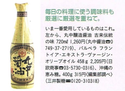 2010.01.29 プレスリリース ● 掲載 クロワッサン きれいの秘密 まず体の中から美しくなることを心がけています。 ゆっくり食事をすること、5分でいいからゆっくりお茶の時間をとることの大切さ。 「薬食同源’と考えています。身体のバランスをきちんと整えるためお茶も食事も大事にしています。」 毎日の料理に使う調味料も厳選に厳選を重ねて。 いま一番愛用している ものはこれ。 丸中醸造醤油 古来伝統の味 料理研究家 コウ静子さん 母の李映林さん、弟のコウケンテツさんも料理研究家として活躍中。