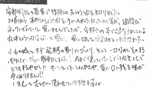 - 203 - 匿名希望 安部司氏の著書で御社のおしょう油を知りました。 以前から 本物のしょう油を手に入れたかったのですが、値段が ネックになっていて買いませんでしたが、安部氏の本で紹介されている 丸中しょう油ならと思い、思い切って注文させていただきました。 小6の娘とまず発酵の香りにびっくり、そして、一口なめてそのまろ やかさにさらに感動しました! 今まで使っていたしょう油に比べ とてもまろやか!!キーンとしたしょっぱさや、変に口に残る味が 全くありません!! 1.8Lを大切に使わせていただきますね。